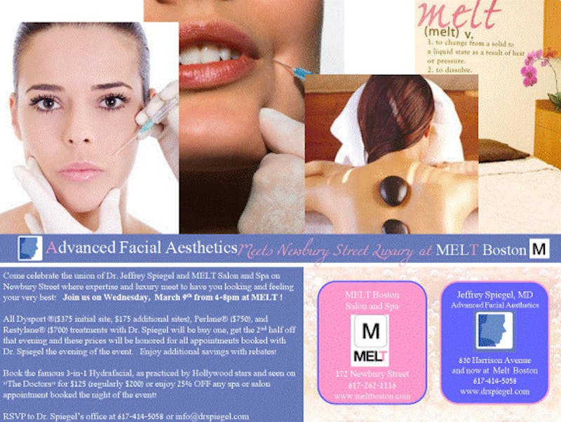 Come celebrate the union of Dr. Jeffrey Spiegel and MELT Salon and Spa on Newbury Street where expertise and luxury meet to have you looking and feeling your very best! Join us on Wednesday, March 9th from 4-8pm at MELT! All Dysport ($375 initial site, $175 additional sites), Perl...