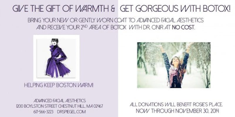 Do you have an older jacket you can part with? Bring in your gently worn coat and we will give you FREE Botox. All donations benefit Rosie’s Place...